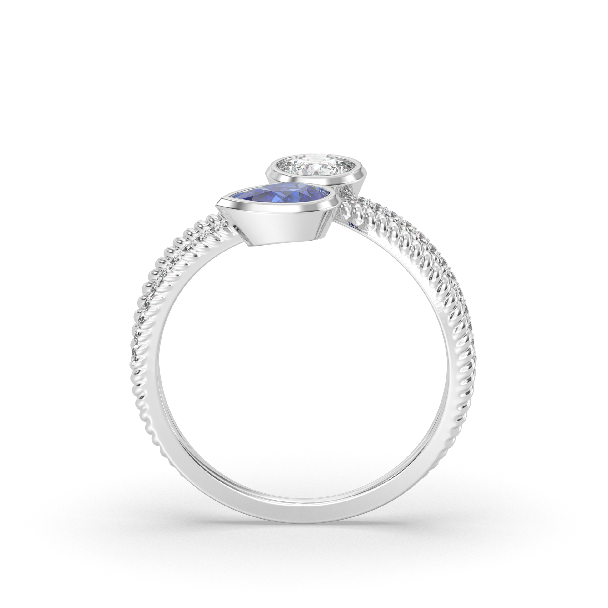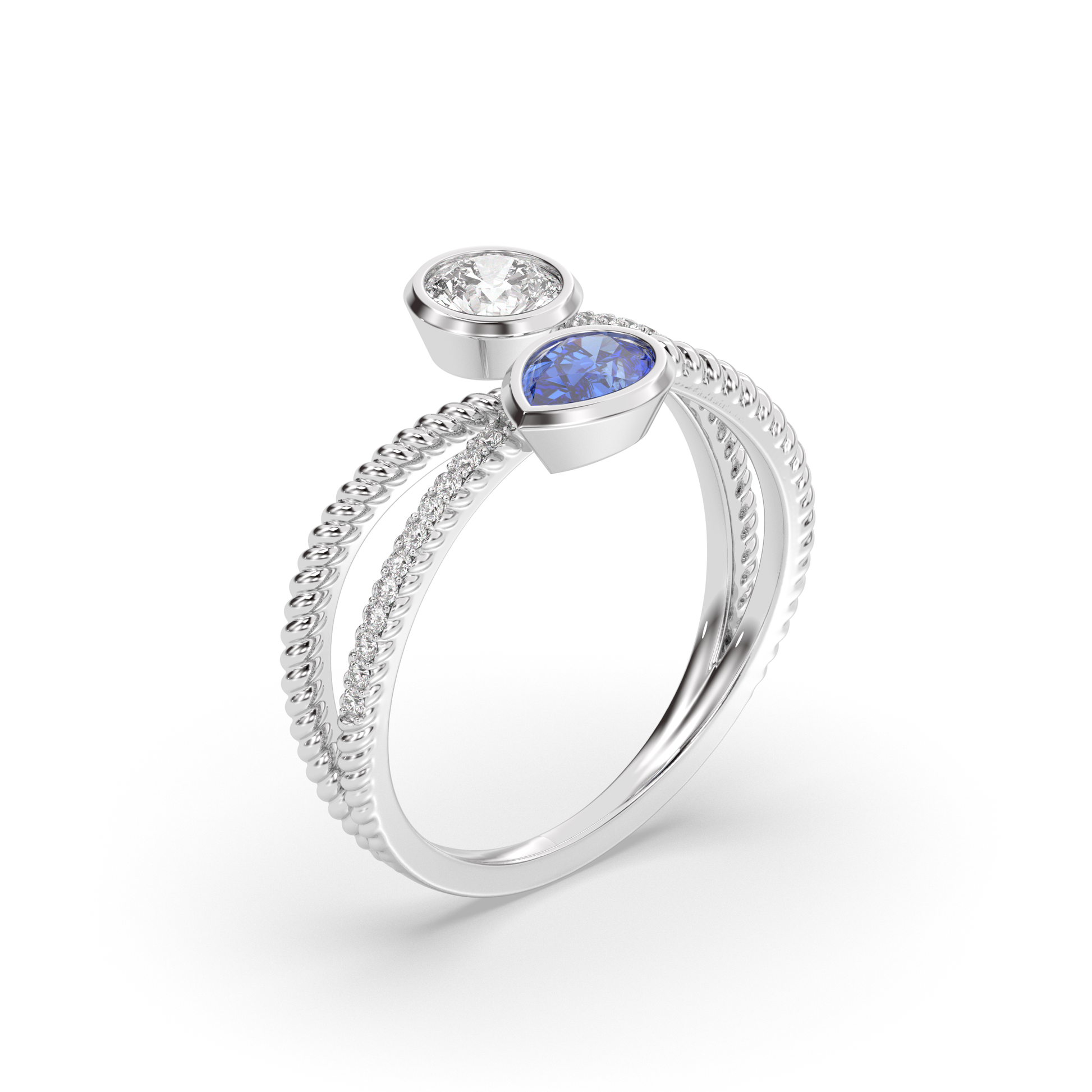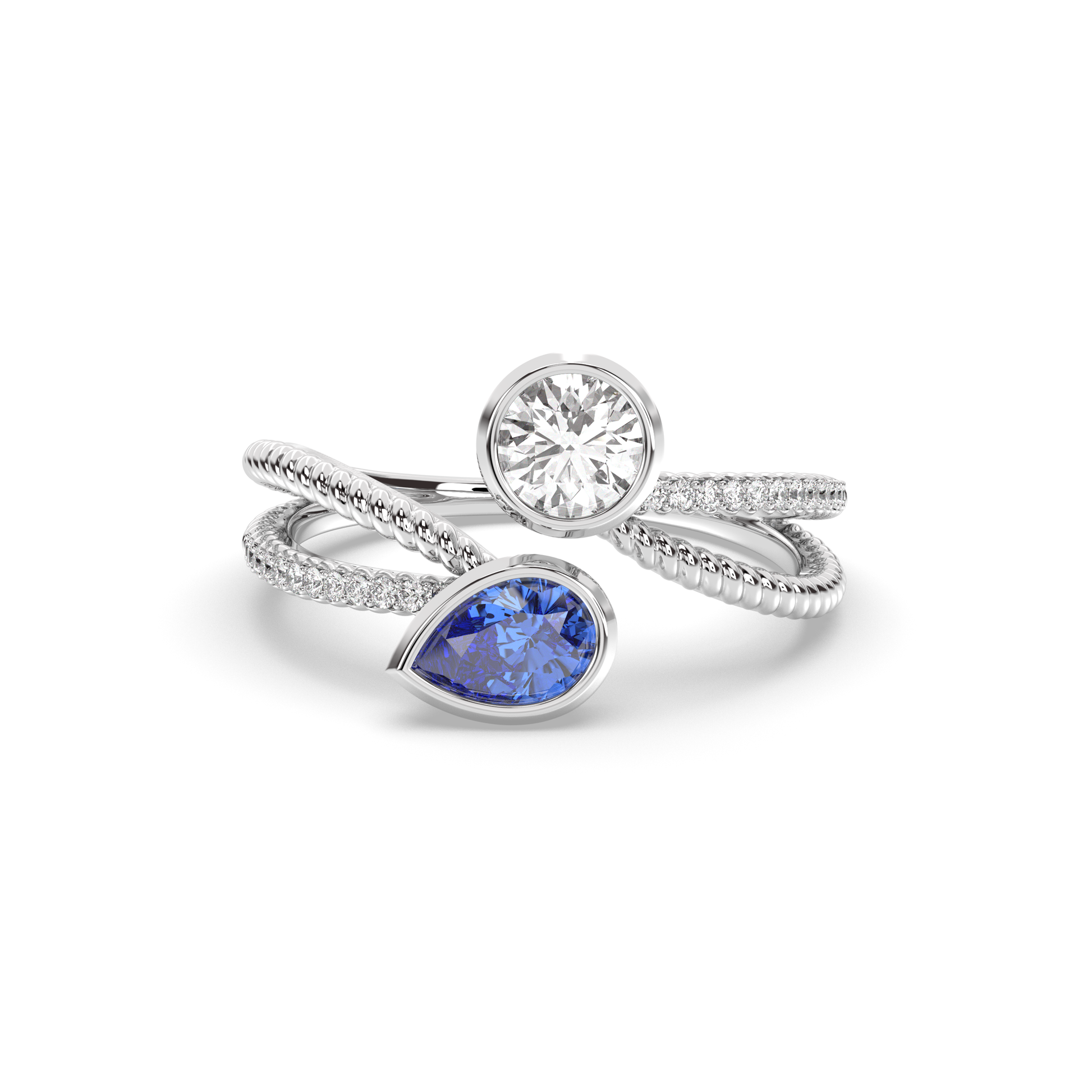 1ct Pear-Shaped Sapphire: The deep blue of the sapphires adds a unique and vibrant touch that contrast beautifully with the diamond.