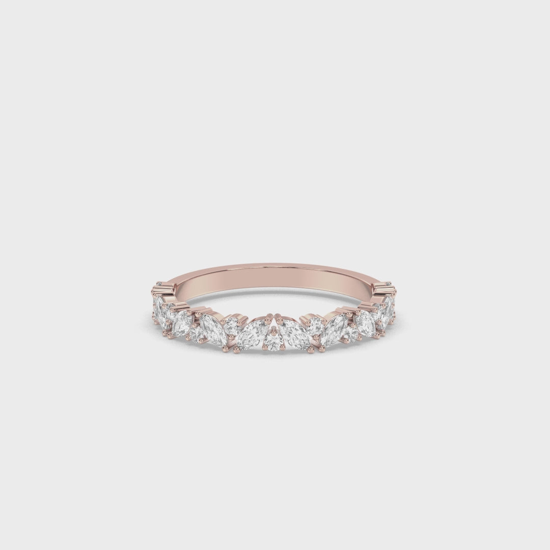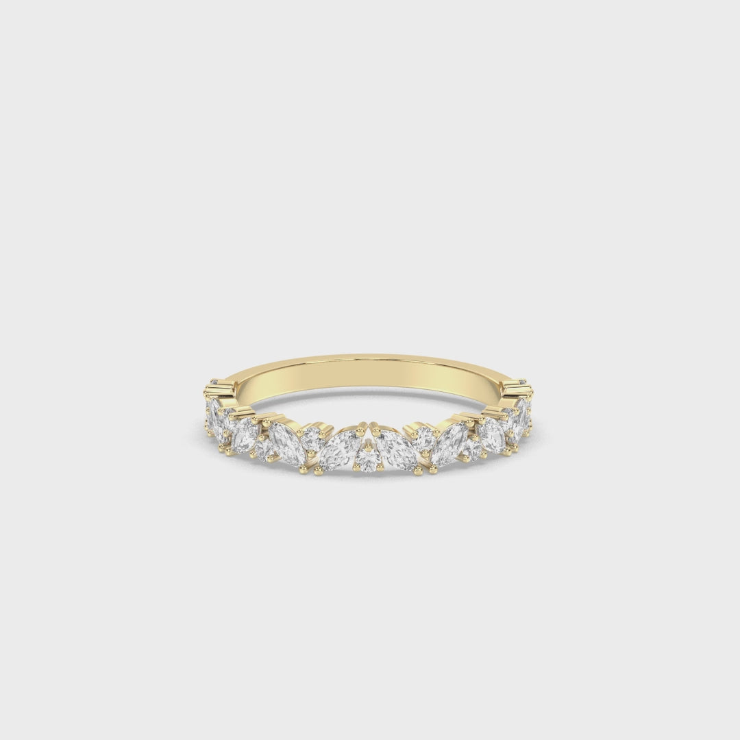 Introducing "Windsor" our marquise, multi-stone wedding band. This stunning piece features a continuous row of marquise and round cut diamonds, each meticulously set in a gleaming gold band. The design reflects the regal beauty and grandeur.