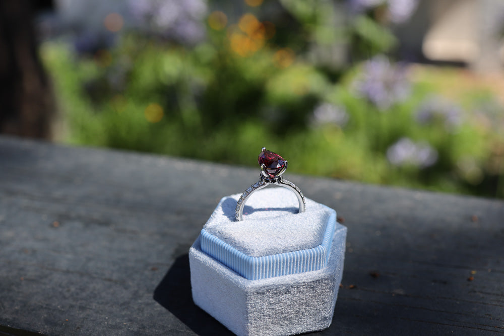 Introducing our "Parati" ring, a modern and sophisticated engagement ring. This Parati ring is a one or a kind. At the heart ring lies a breathtaking pear-shaped Umbalite garnet center stone. This is a rare and exquisite gemstone, with rich raspberry-red hues. This ring is super pretty and sparkles in all lighting. A very unique aesthetic with black diamonds in her hidden halo and a band adorned with pavé set diamonds.