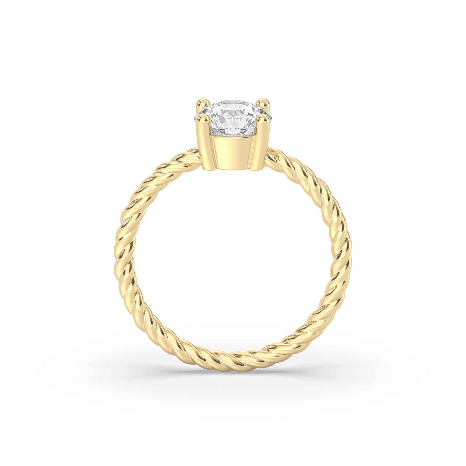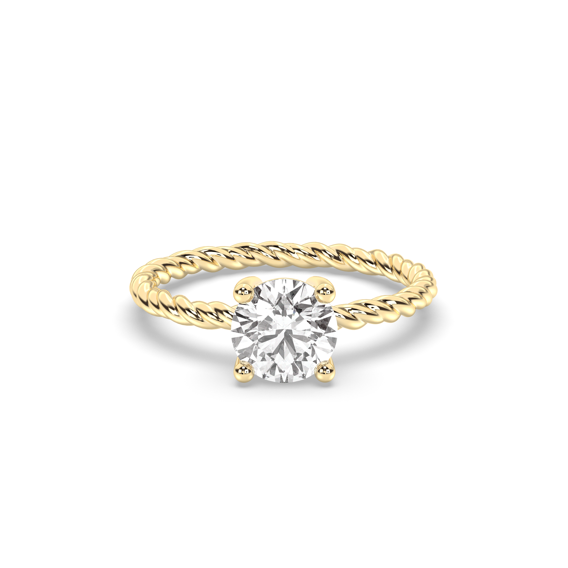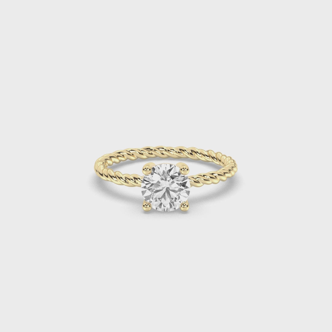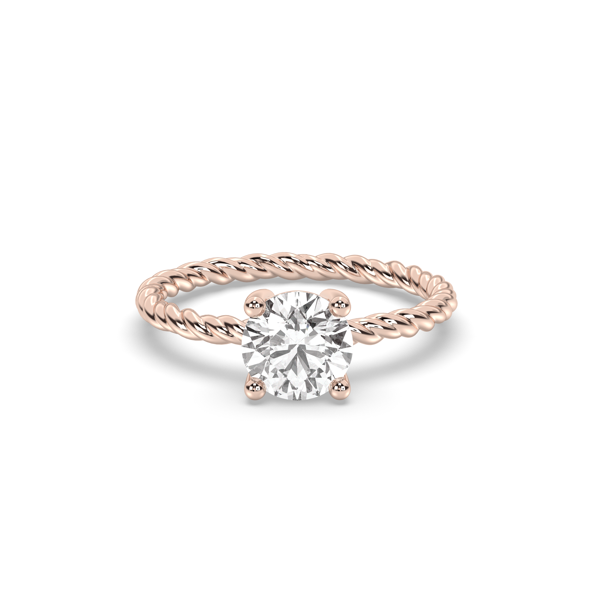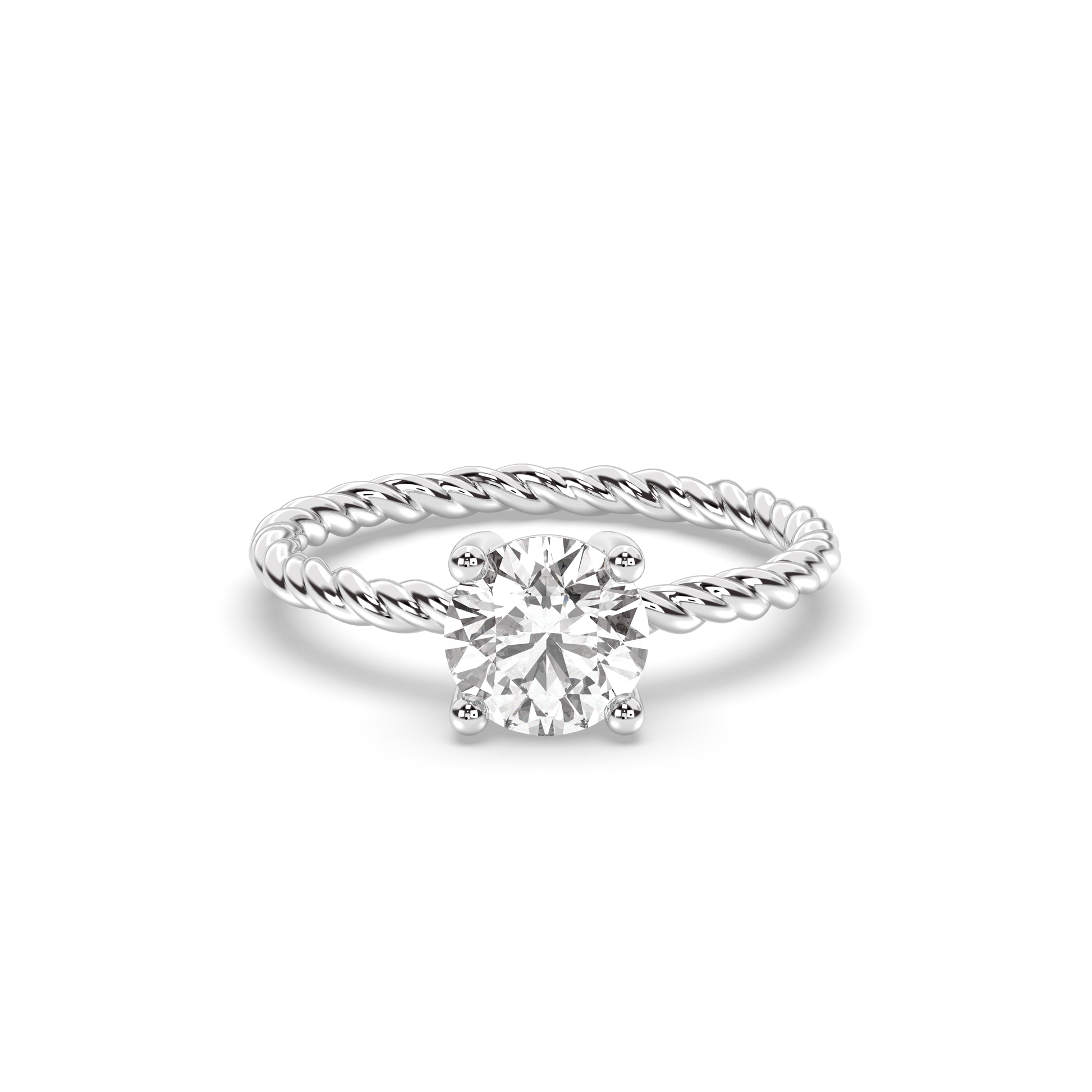 The Helix solitaire engagement ring features a slender twisted rope band that elegantly encircles the finger, leading to a stunning round center diamond.