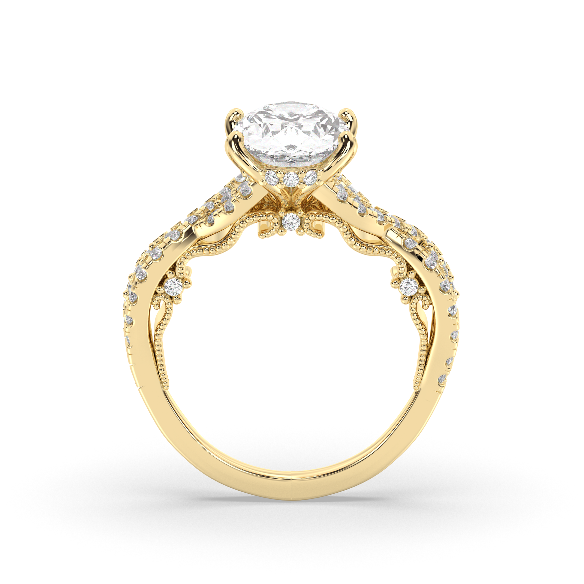 - The band is elevated with pavé-set diamonds, enhancing the ring's sparkle.